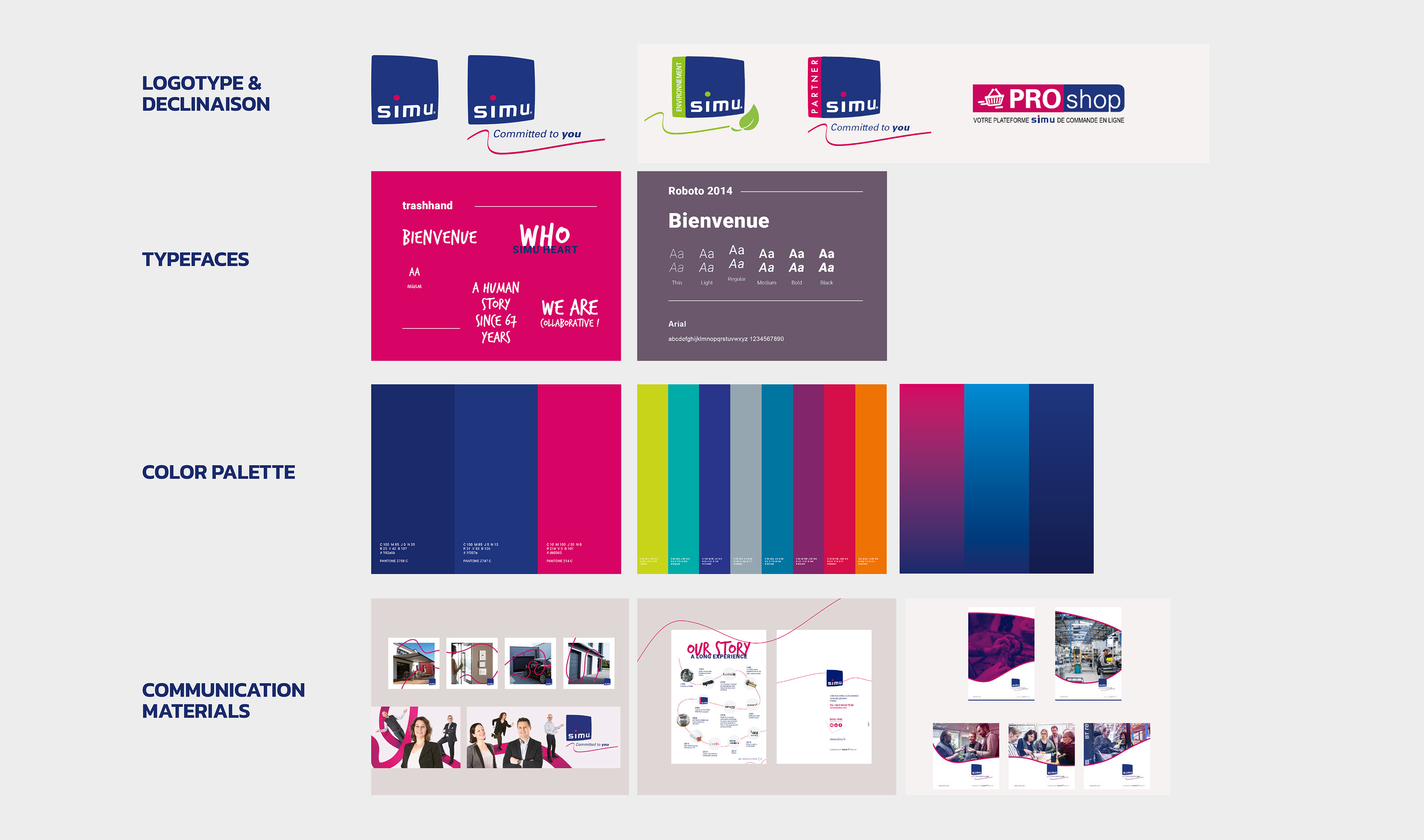 The logotype is echoing Simu's offering. Each of the component are shaping the monogram, like Simu is providing a solution to any problematic.This direction is retaining the human and vivid personality of the current identity with a bright color palette and dynamic graphic pattern.
